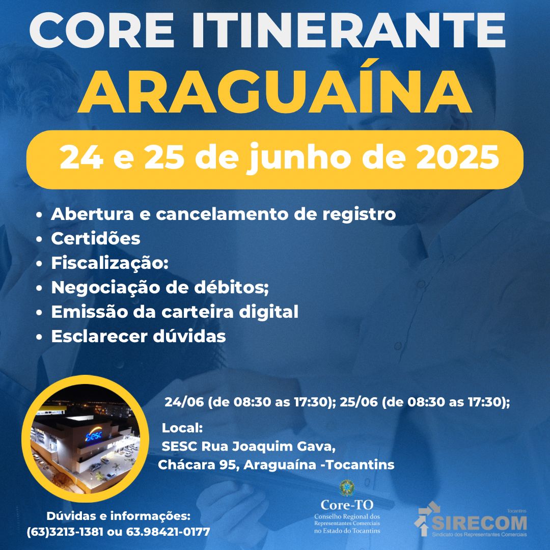 O Conselho Regional dos Representantes Comerciais no Estado do Tocantins (CORE-TO) estará em Araguaína, nos dias 24 e 25 de junho, com mais uma edição do Projeto Core Itinerante.