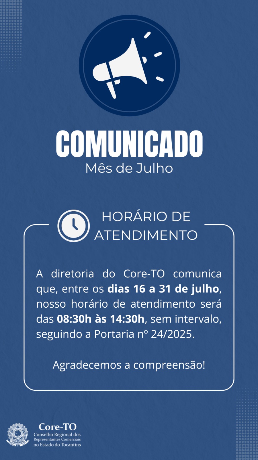 A diretoria do Core-TO informa que, entre os dias 16 a 31 de julho, o horário de atendimento ao público será temporariamente reduzido. Nesse período, os atendimentos ocorrerão das 08:30h às 14:30h, sem intervalo, seguindo a Portaria nº 24/2025.
