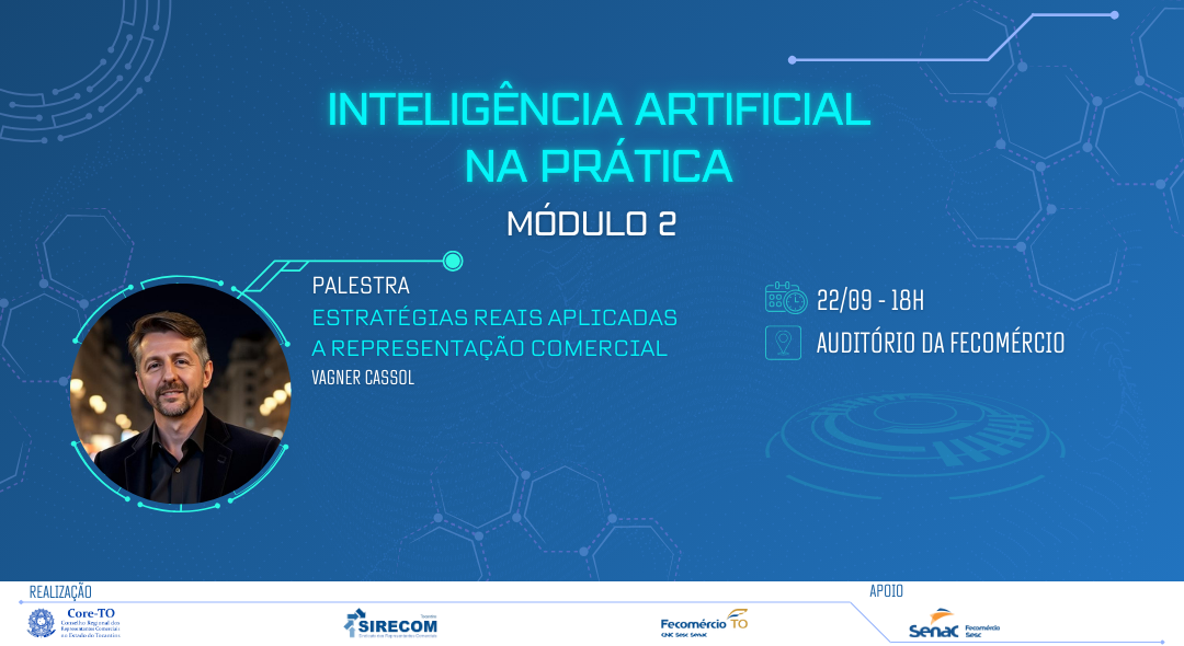 O Core-TO e o Sirecom-TO, em parceria com a Fecomércio-TO e o Senac, estão promovendo o evento Inteligência Artificial na Prática, que traz uma capacitação exclusiva voltada aos representantes comerciais interessados em compreender, na prática, como a Inteligência Artificial (IA) pode impactar e transformar o exercício da profissão.