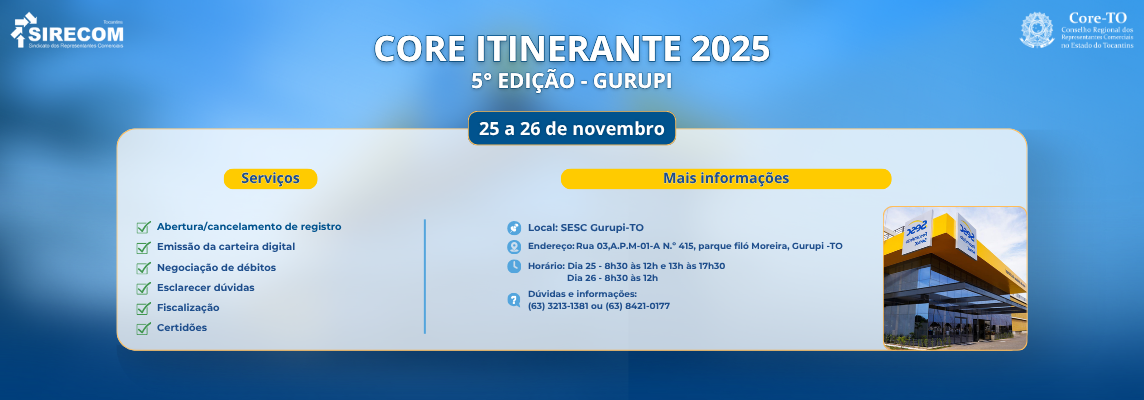 O Conselho Regional dos Representantes Comerciais no Estado do Tocantins (CORE-TO) estará em Gurupi, nos dias 25 e 26 de novembro, com mais uma edição do Projeto Core Itinerante.